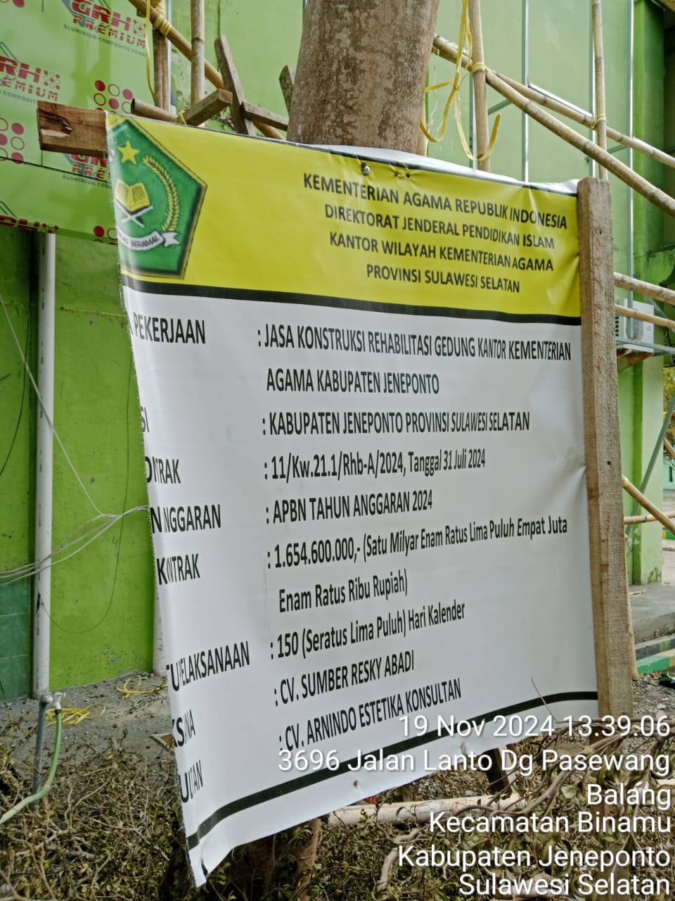 Potolotepo, Jeneponto | Lembaga Swadaya Masyarakat (LSM) Komunitas Peduli Lingkungan Ekonomi Sosial (L-Kompleks) melayangkan laporan dugaan tindak pidana korupsi pada proyek Rehabilitasi Gedung Kantor Kementerian Agama Kabupaten Jeneponto Tahun Anggaran 2024, Rabu (26/11/2025).