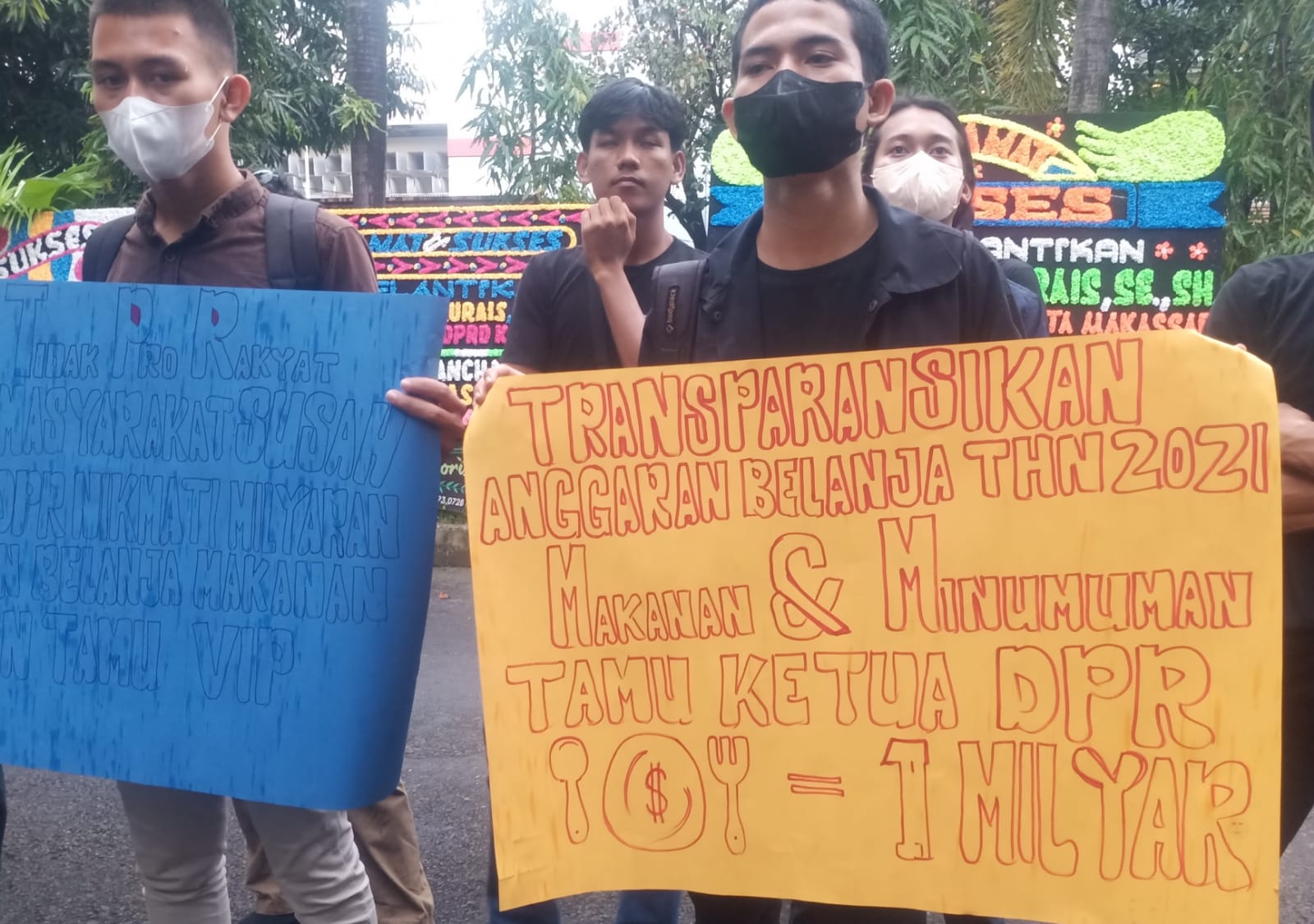 Milliaran Lebih anggaran makan minum Rujab DPRD Kota Makassar tercuap Hal tersebut terlihat dengan turunnya aksi unjuk rasa Aliansi Pemuda Satu ke kantor DPRD Kota Makassar guna mempertanyakan relesasi perbelanjaan senilai 1 Milliar lebih yang di peruntukkan tamu Vip Rujab DPRD, Kamis (31/3/2022).